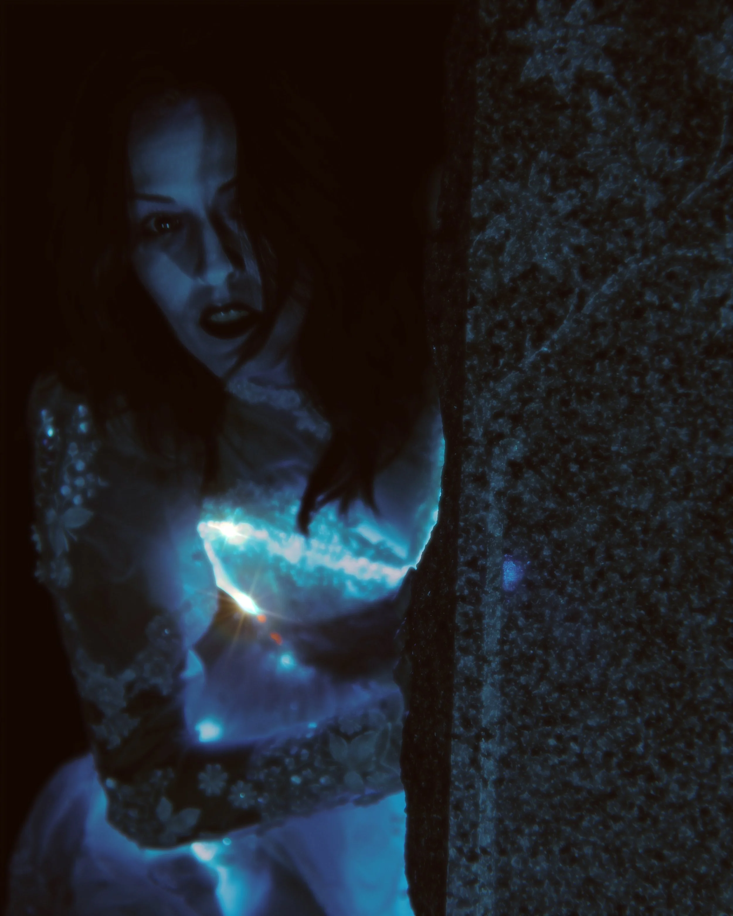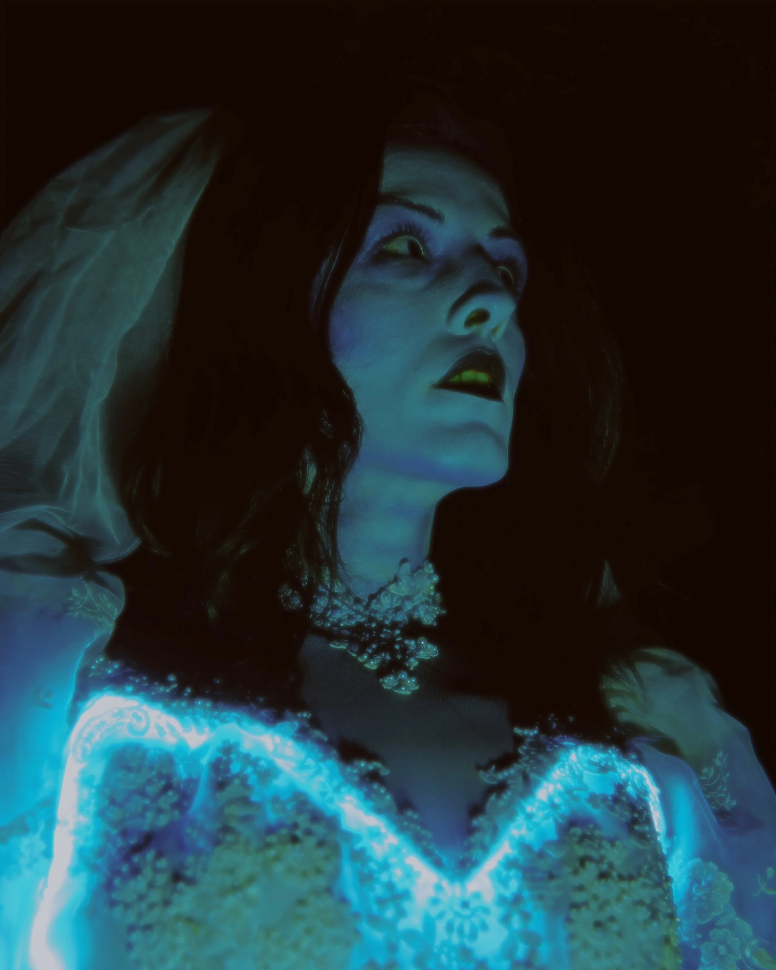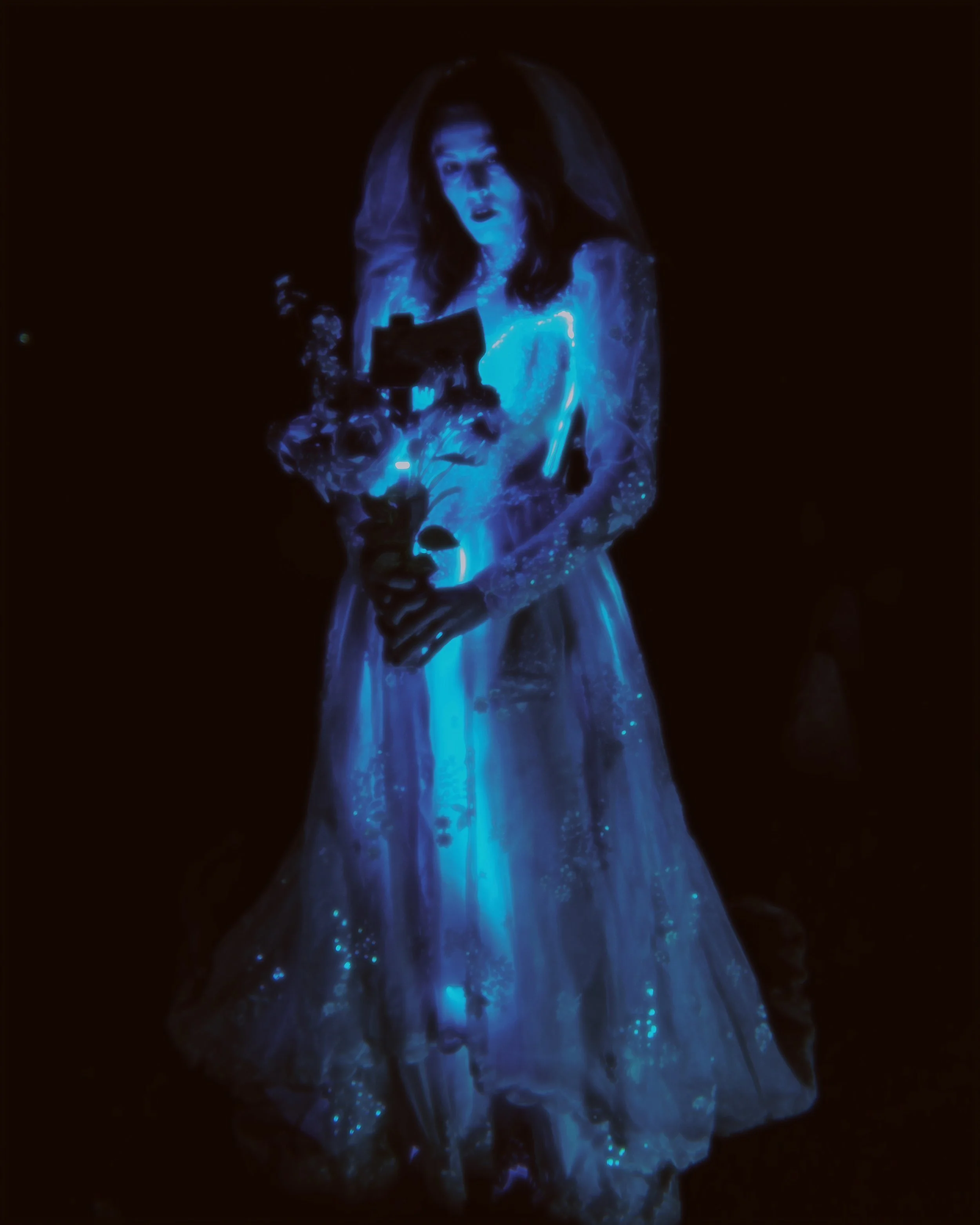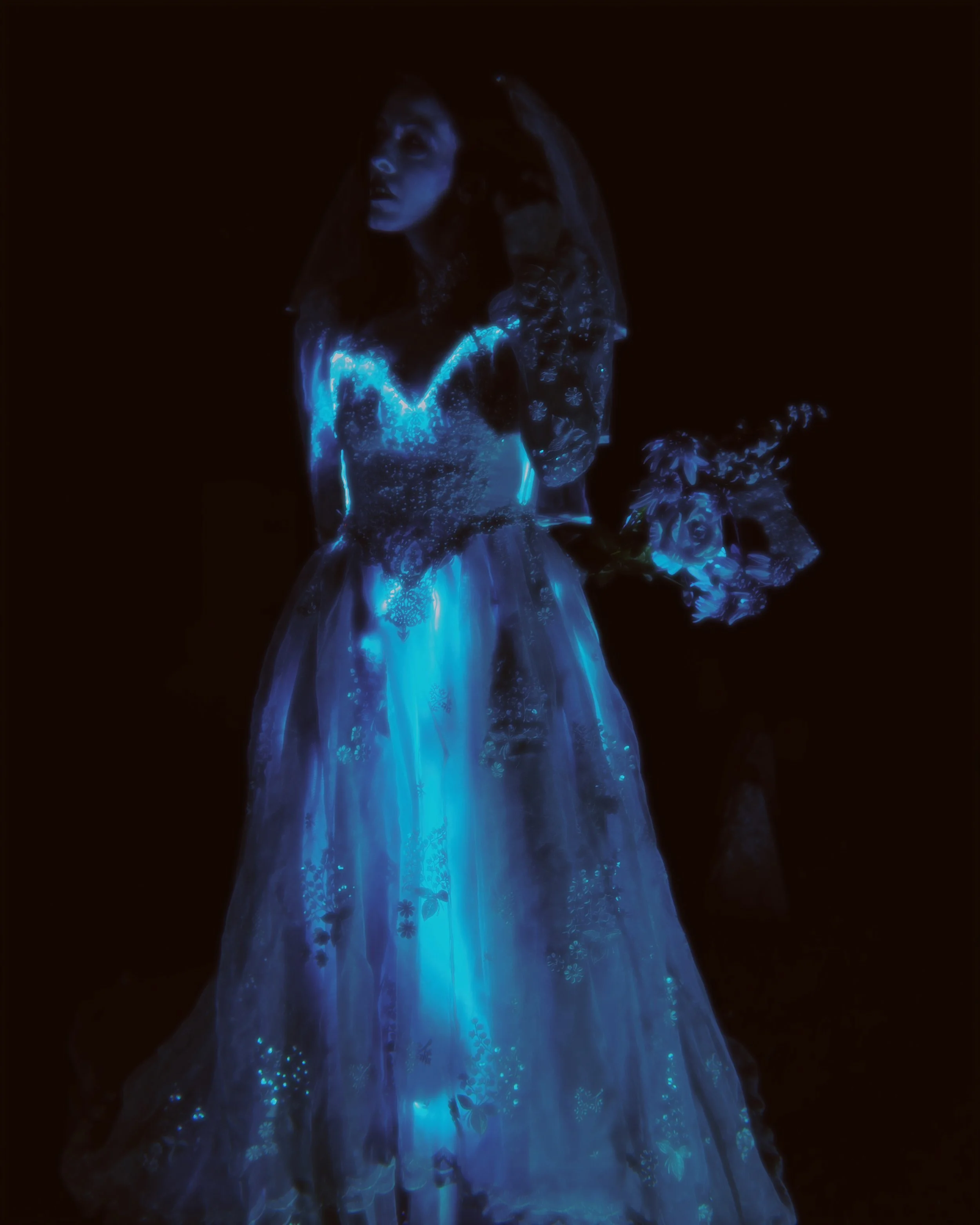 This second-hand wedding dress was transformed into an ethereal ghost costume for a professional haunt actor. It features meticulously soldered LED light strips integrated throughout the bodice and skirt, powered by a single USB-A connector that plugs into a portable power bank concealed beneath the skirt. The design delivers maximum visual impact in dark environments while offering the performer complete mobility and ease of use, combining sustainability, innovation, and immersive horror aesthetics.