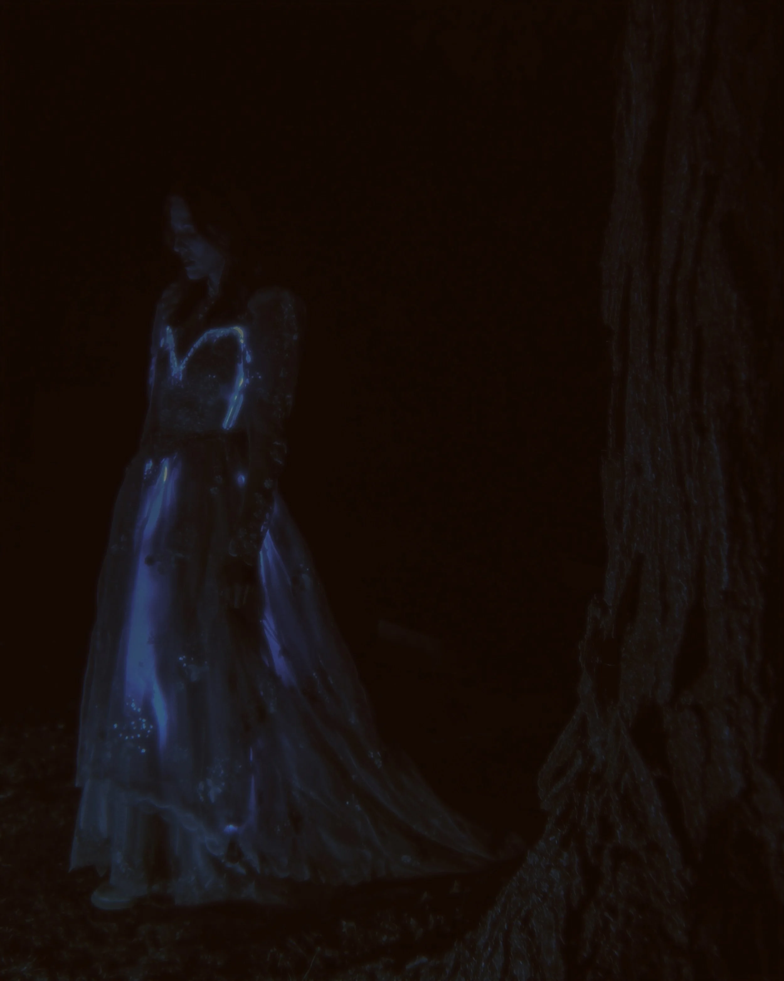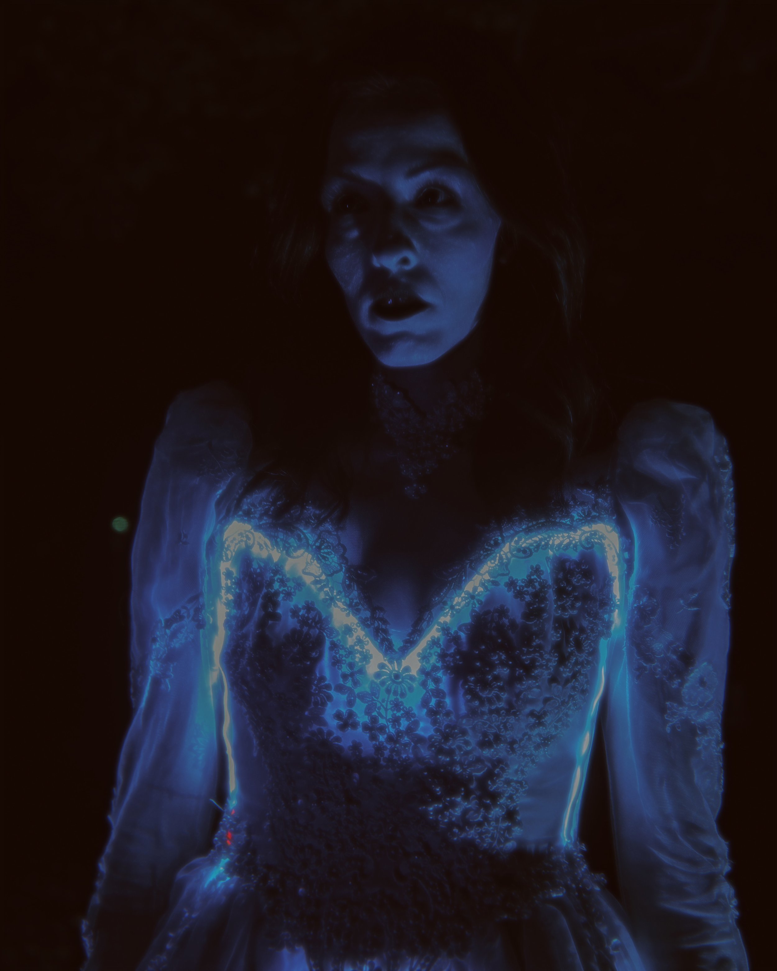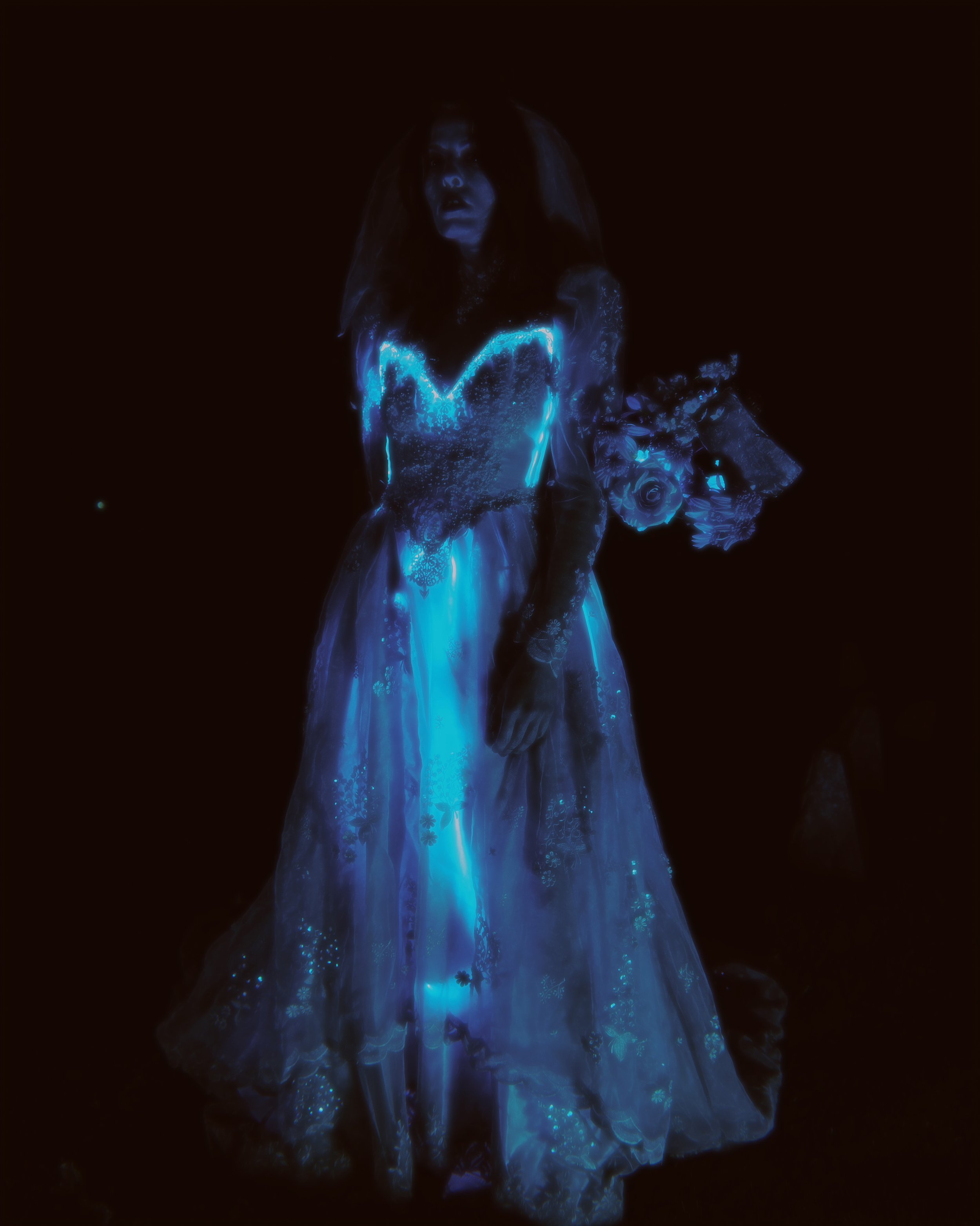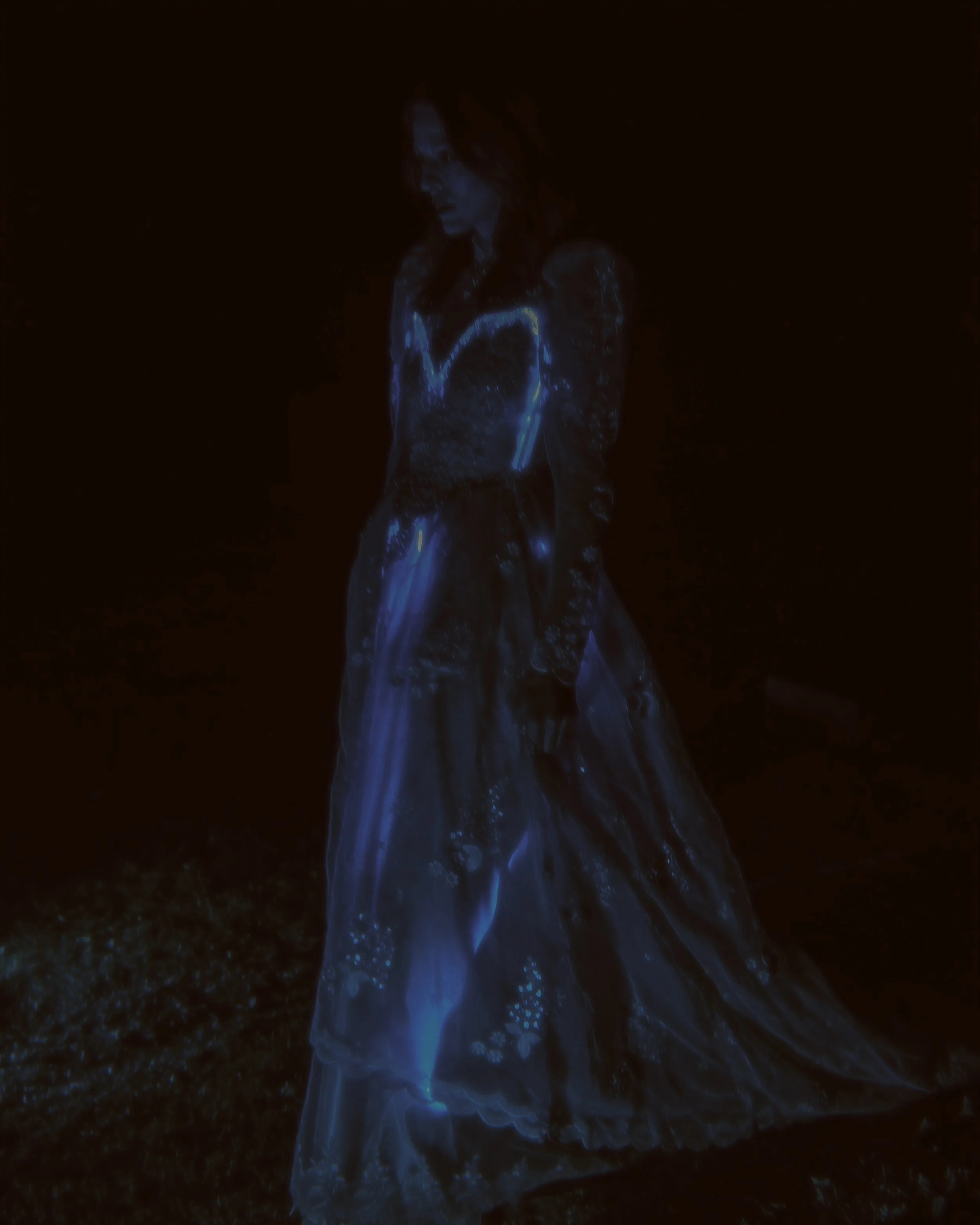 This second-hand wedding dress was transformed into an ethereal ghost costume for a professional haunt actor. It features meticulously soldered LED light strips integrated throughout the bodice and skirt, powered by a single USB-A connector that plugs into a portable power bank concealed beneath the skirt. The design delivers maximum visual impact in dark environments while offering the performer complete mobility and ease of use, combining sustainability, innovation, and immersive horror aesthetics.