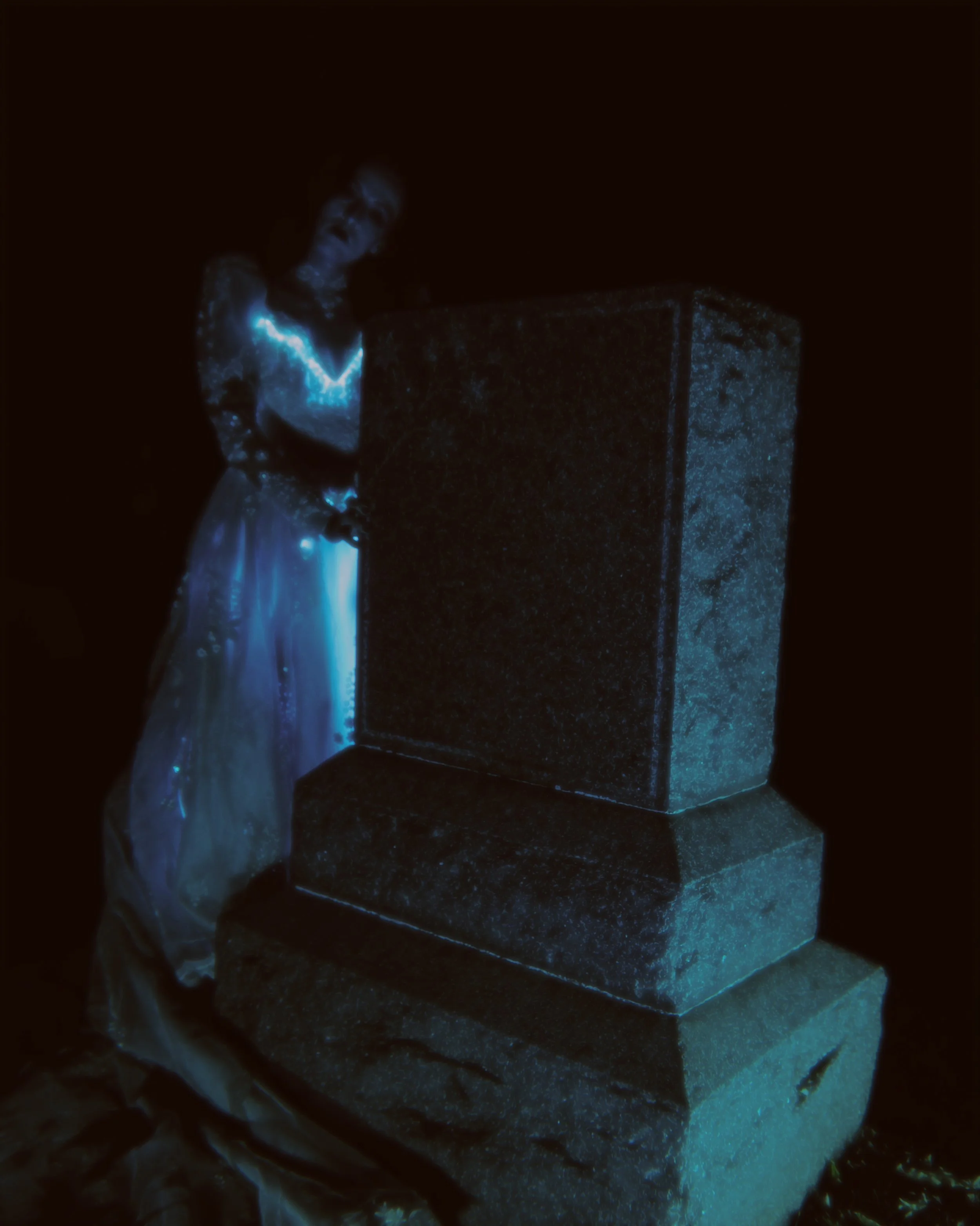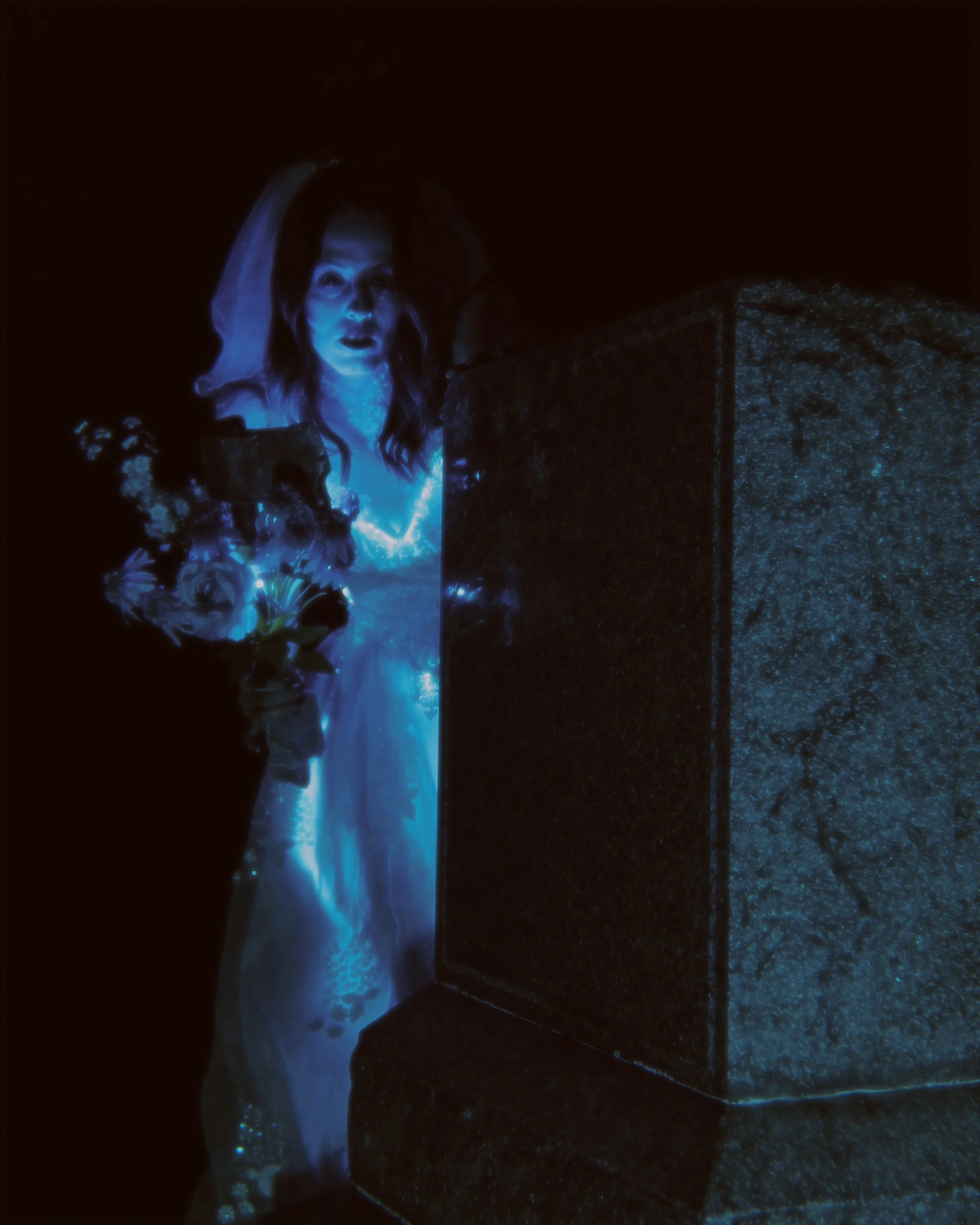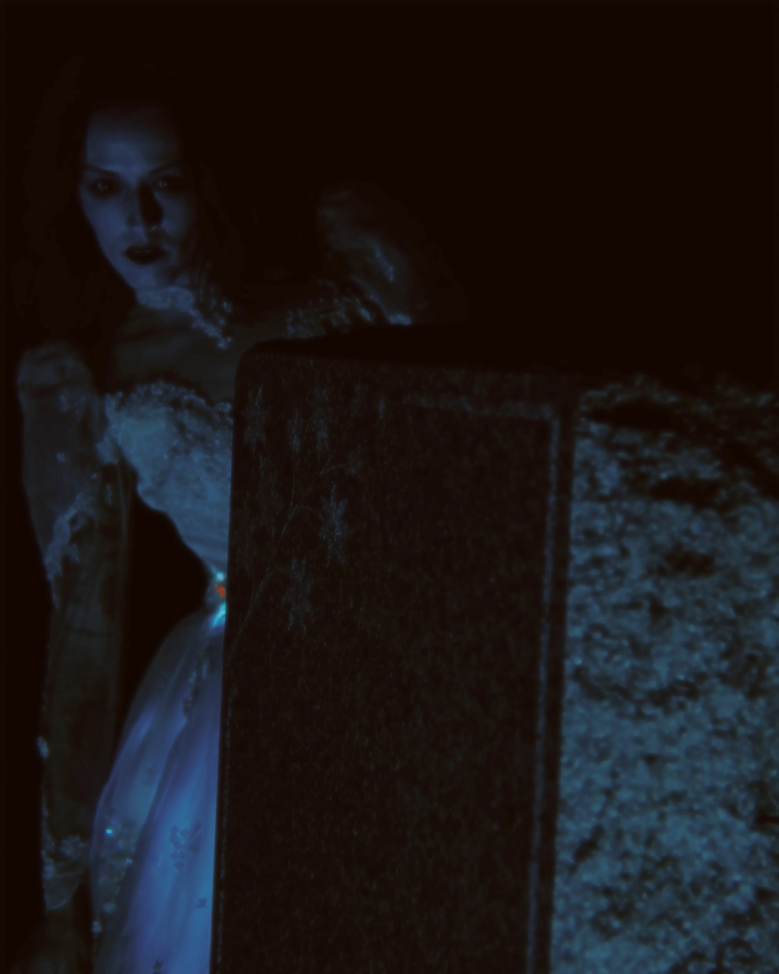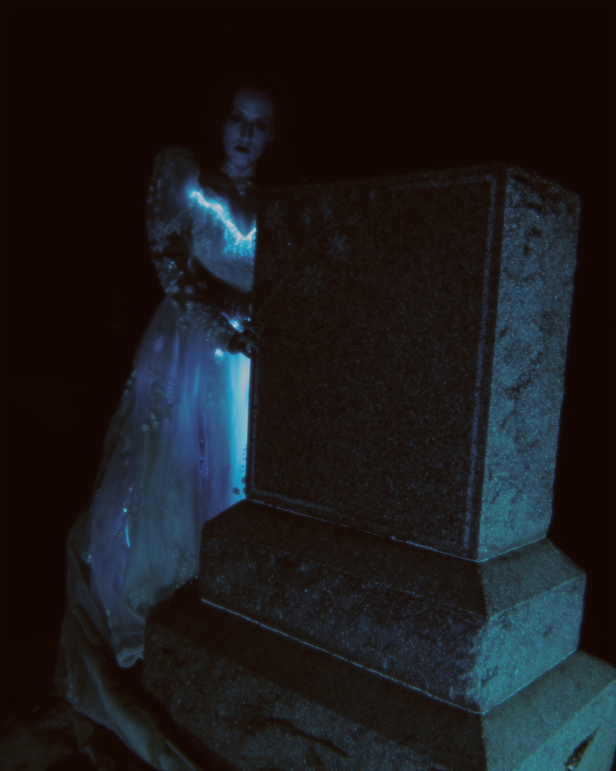 This second-hand wedding dress was transformed into an ethereal ghost costume for a professional haunt actor. It features meticulously soldered LED light strips integrated throughout the bodice and skirt, powered by a single USB-A connector that plugs into a portable power bank concealed beneath the skirt. The design delivers maximum visual impact in dark environments while offering the performer complete mobility and ease of use, combining sustainability, innovation, and immersive horror aesthetics.