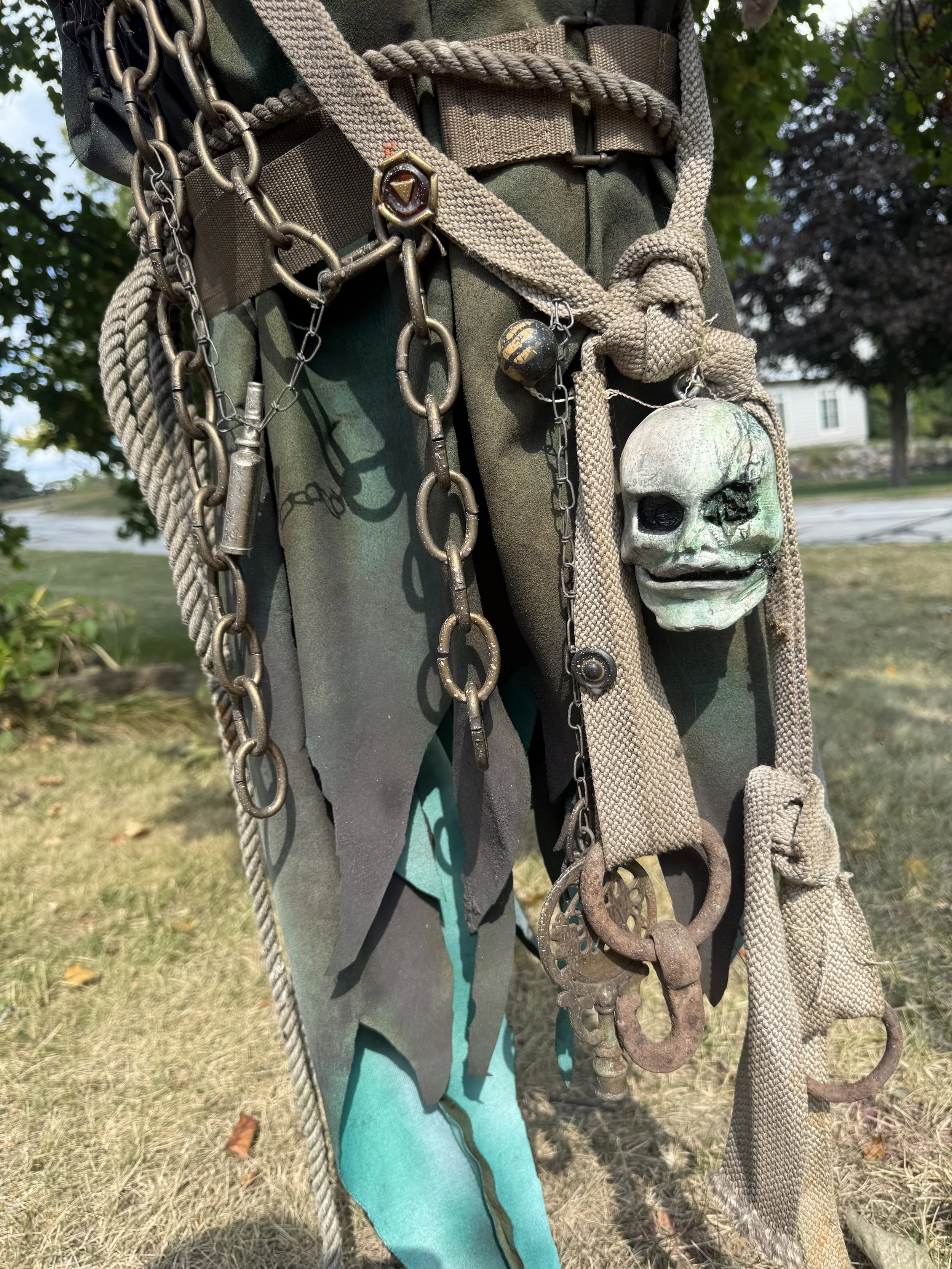 This character costume was custom-built from the ground up for a haunt performer. The tunic was created entirely from scratch, starting as a flat sheet of fabric and tailored into a rugged, primitive garment. The mask is a repurposed Don Post design from the early 2000s, extensively modified and reimagined to bring the character to life. Completing the look is a fully custom chained cross-body strap featuring antique metal elements, assorted vintage buttons, and a Blade skull centerpiece as a tribute to the iconic character from the film Puppet Master.